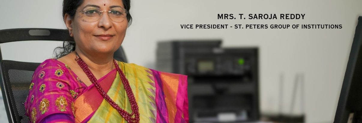 Mrs. T. Saroja Reddy envisions transforming St. Peter’s Engineering College into a premier center of excellence in engineering education—one that not only delivers high-quality technical instruction but also empowers students to learn, lead, and develop solutions for the real-world challenges of tomorrow. Her forward-looking vision also includes enhancing the institution’s national visibility through strategic academic partnerships, improved rankings, and strong alumni engagement, positioning the college as a hub of academic and professional excellence.