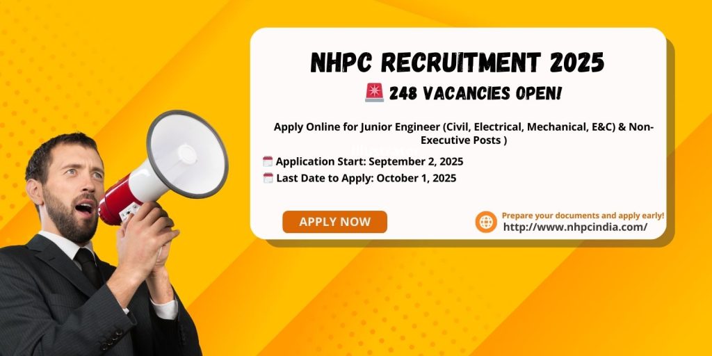 The National Hydroelectric Power Corporation Limited (NHPC) has unveiled a major recruitment drive for 2025, offering 248 vacancies for Junior Engineer roles across Civil, Electrical, Mechanical, and E&C streams, as well as various Non-Executive positions. Aspiring candidates who meet the eligibility requirements can apply for these coveted roles starting September 2, 2025, via NHPC’s official website, www.nhpcindia.com.