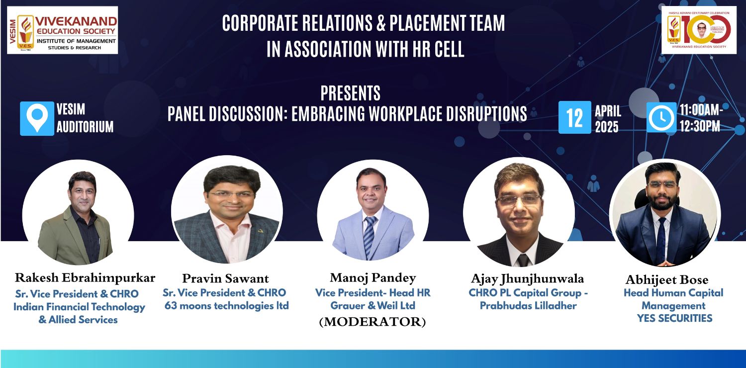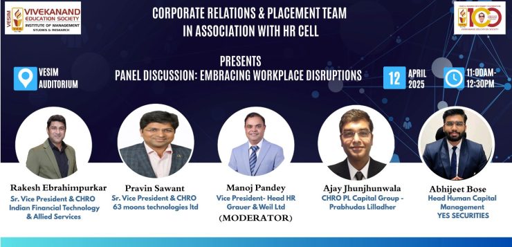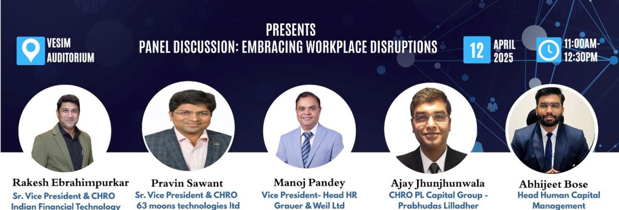 On 12 April 2025, VESIM hosted an insightful and forward-looking panel discussion on “Embracing Workplace Disruptions.” at VESIM Auditorium The event brought together thought leaders from the HR domain to explore how organizations and professionals can navigate the evolving world of work.