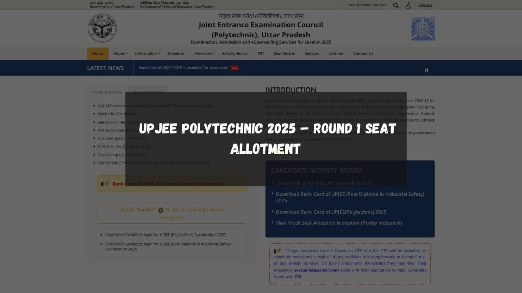 The Joint Entrance Examination Council, Uttar Pradesh (JEECUP) is all set to release the Round 1 seat allotment results for the UPJEE Polytechnic 2025 counselling process. Once announced, candidates who registered and filled in their choices can check their allotment status on the official website: jeecup.admissions.nic.in.